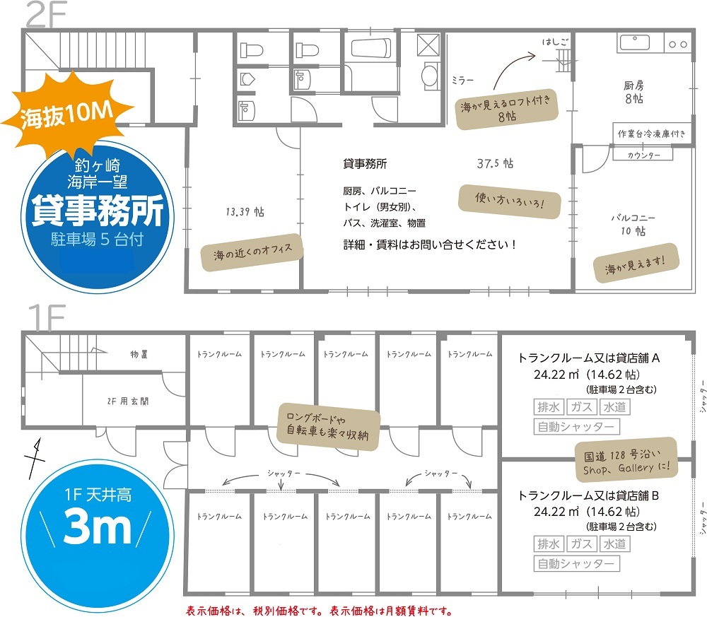 | 賃料 | 1F:1-11:11000円〜15000円別途消費税 2F:お問合せください |